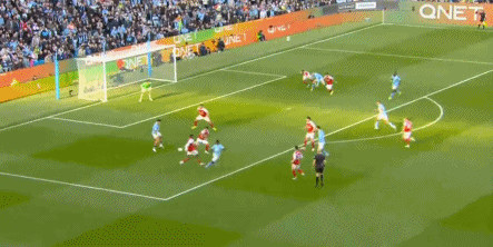 在切尔基率先为曼城破门之后,多纳鲁马的失误让哈弗茨为阿森纳扳平比分。比赛的第65分钟,多库左路斜传,奥莱利背身横传,哈兰德扫射破门,曼城再次取得领先。